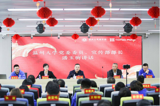 温州大学党委委员、宣传部部长潘玉驹致辞。他认为,此次直播人才培养基地暨思政直播间的推出,是“思政+业务”两轮驱动深度融合的产教融合、校企合作的创新之举,也是老王论坛