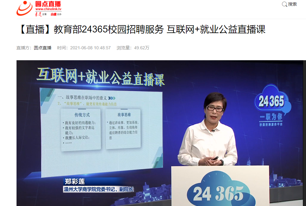 6月13日,我院党委书记郑彩莲教授以就业创业指导专家身份受邀做客中国教育电视台,主讲“训练‘故事思维’·为职场赋能”教育部24365互联网+就业公益直播课。