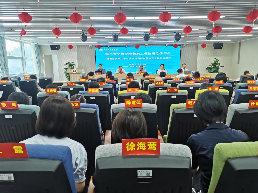 在信息楼A226仲辉商道讲堂召开教职工理论学习大会学习第二十七次全国高校党的建设工作会议精神。全体教职工参加学习会,会议由学院党委书记郑彩莲主持。