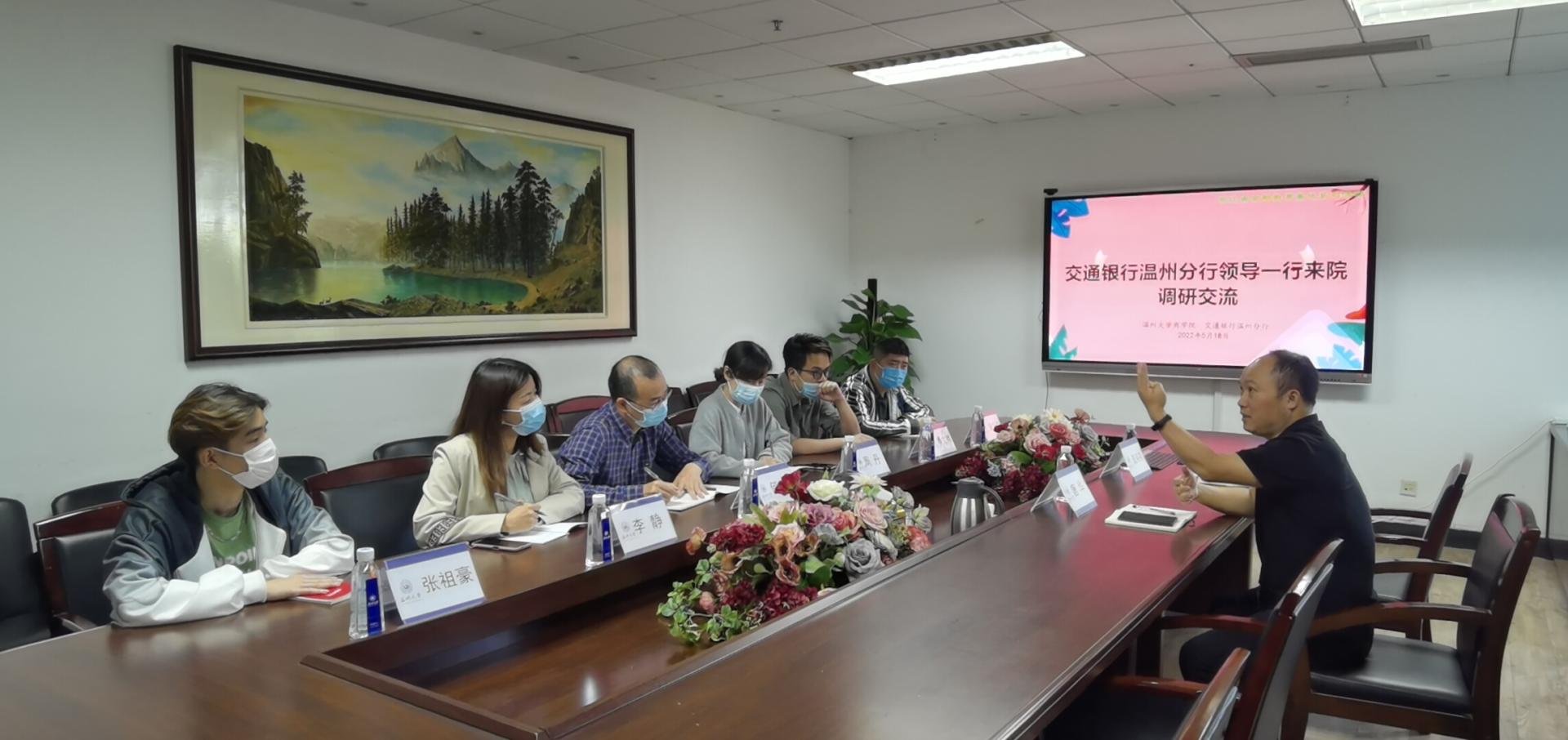 2022年5月18日上午,交通银行交行温州分行综管部副总经理何上宇、交通银行温州分行消费者权益保障部负责人周丹、交通银行温州分行消费者权益保障部高级服务专员李静等一行来我院调研交流。