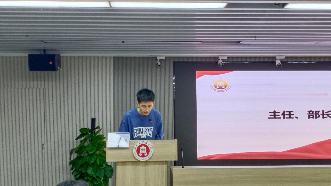 上一届党员服务中心主任朱宇哲、部长代表凌佳妮发言。他们分别总结了自己分管部门在过去一年中取得的工作成绩并分享了个人在工作中收获的心得体会。他们认为,学生干部在工作中应该要分清角色转变,明确自己身份;要有“大团队思想”,杜绝个人主义和小团队思想;要学会从“理念层”转换到“管理层”和“实践层”;对干事的管理要张弛有度,鼓励多于批评。
