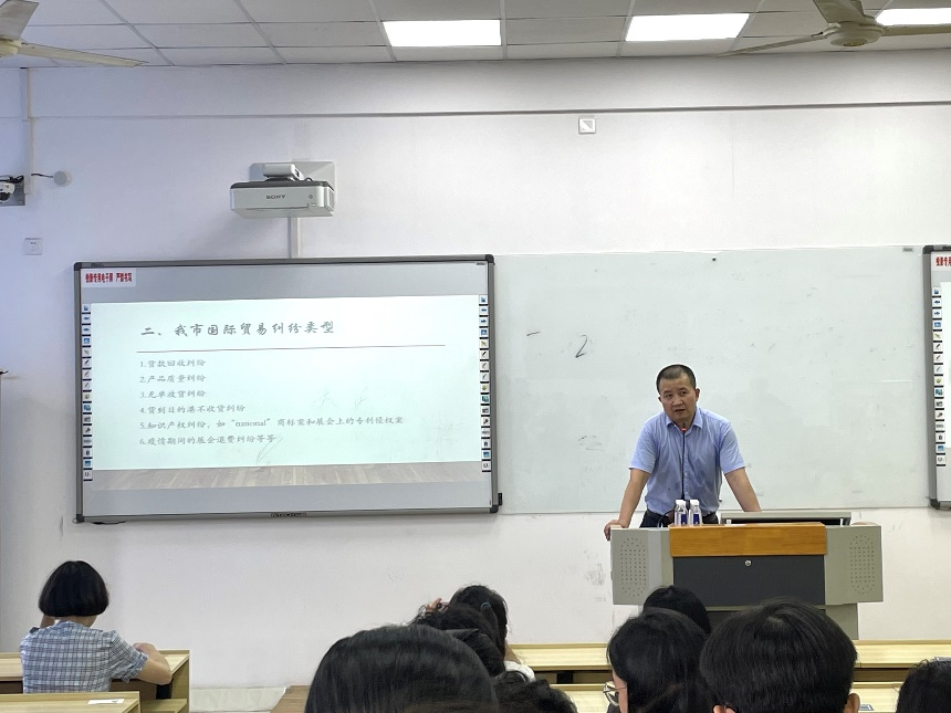 2022年6月16日下午14时,在北校区3号楼301教室,为丰富专业认知课的见习内容,叶春霞老师和郑慧老师邀请了温州市贸促会联络合作部钟国强部长给同学们做了专题讲座,让同学们进一步了解国际贸易实务中所遇到的贸易纠纷及解决方法。