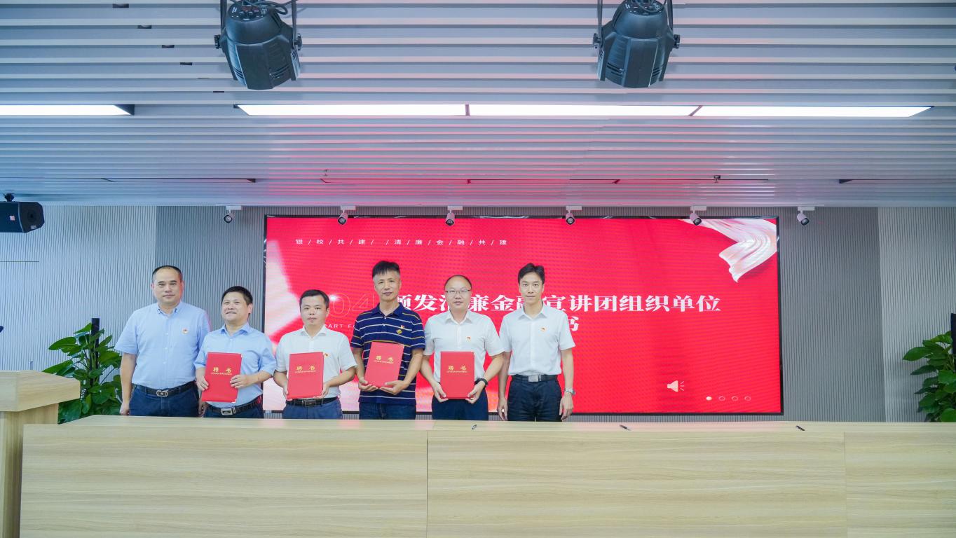 温州大学纪委副书记、纪检监察室主任、巡察办主任杨立淮和温州银保监局党委书记、局长朱燕军为清廉金融宣讲团组织单位颁发聘书。