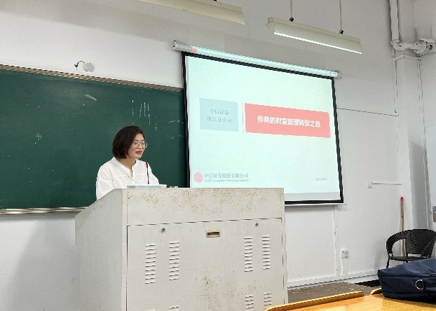 黄灵经理首先简单介绍了自己,随后询问同学们是否了解证券行业及近几年的发展,从而引出了本次讲座的主题—财务管理,讲述了作为证券从业人员,要积极了解并挖掘客户的需求,实现对于客户的最优财务管理。鼓励金融工程系学生认真学习专业知识,才能更加全面的帮助客户进行分析自身的财务状况并合理确定客户的财富目标,进而制定科学可行的计划实现无忧财务管理;其次,黄灵经理讲述了中信证券向财务管理转型的相关知识,借助自身经历和中信证券公司对于员工的要求,中信证券公司要求员工保持好奇心,好胜心并要好为人师,并要求应当具备专业能力,业务能力以及沟通能力。因此黄灵经理也积极鼓励学生在日常生活中积极参与实践实习,明确目标,坚持完善自己才能达到自己的最终目标。最后,黄灵经理还较为详细的介绍了中信公司的各个业务组,让同学们对于中信公司的理解更加的深刻。