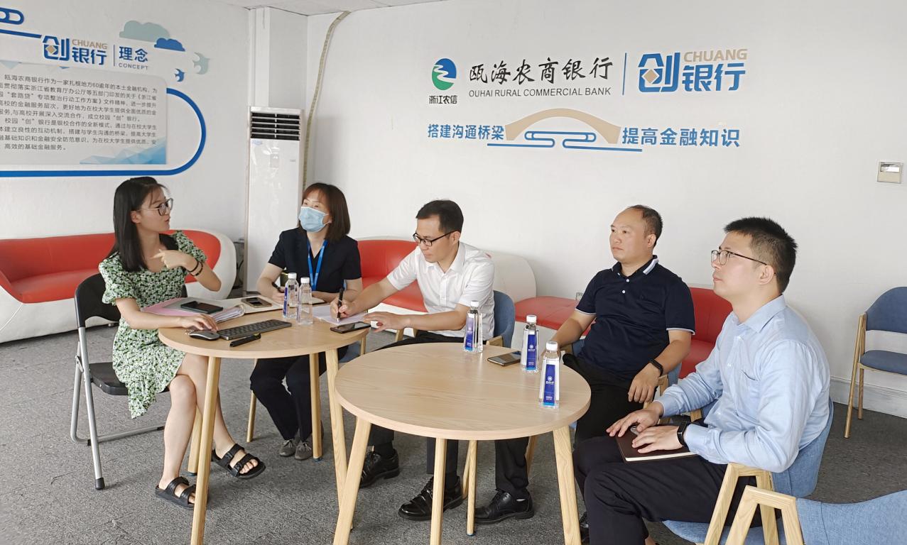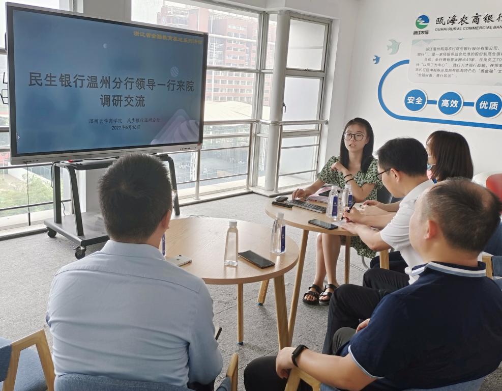 随后,党务秘书聂海燕老师对基地建设情况作简要汇报。金融教育基地建设主要围绕“进学校、进社区、进农村、进企业”这“四进”开展,学院与各合作单位通过回访交流,共同谋划主题活动、加大宣传力度、注重团队培养等四个方面的工作展开共建,不仅能进一步加深与各共建单位的友谊,还能探寻深化“银校共建”合作的切入点,不断拓宽合作渠道。截至目前,学院已和招商银行温州分行、瓯海农商银行等单位合作,依托金融教育基地联合,陆续开展了“防诈反诈宣讲”“金融教育知识进班级”“大学生金融教育共富结对”等系列活动。同时,基地的建设提升与良好的宣传氛围、团队培养密不可分,只有将金融教育基地活动开展情况和取得成果进行宣传和报道,才能增加基地的曝光度和知名度;只有依靠学生团队,才能将金融教育基地建设活动的开展落到实处。