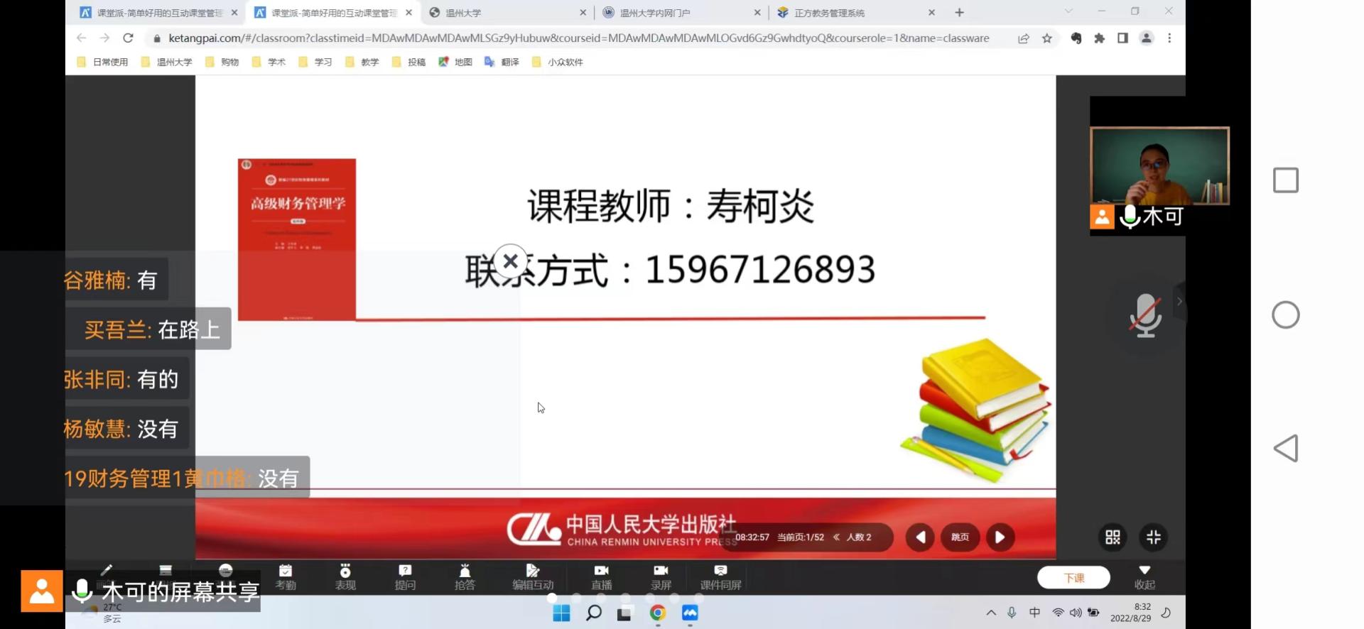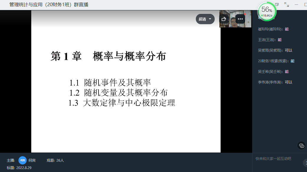 何宾老师早早来到《管理统计与应用》线上课堂,做好线上授课的各种准备,老师专业素养好,备课充分,师生互动良好,吐词清晰,专业内容丰富。线上教学工具熟练,课堂语言通俗易懂,教学效果好。