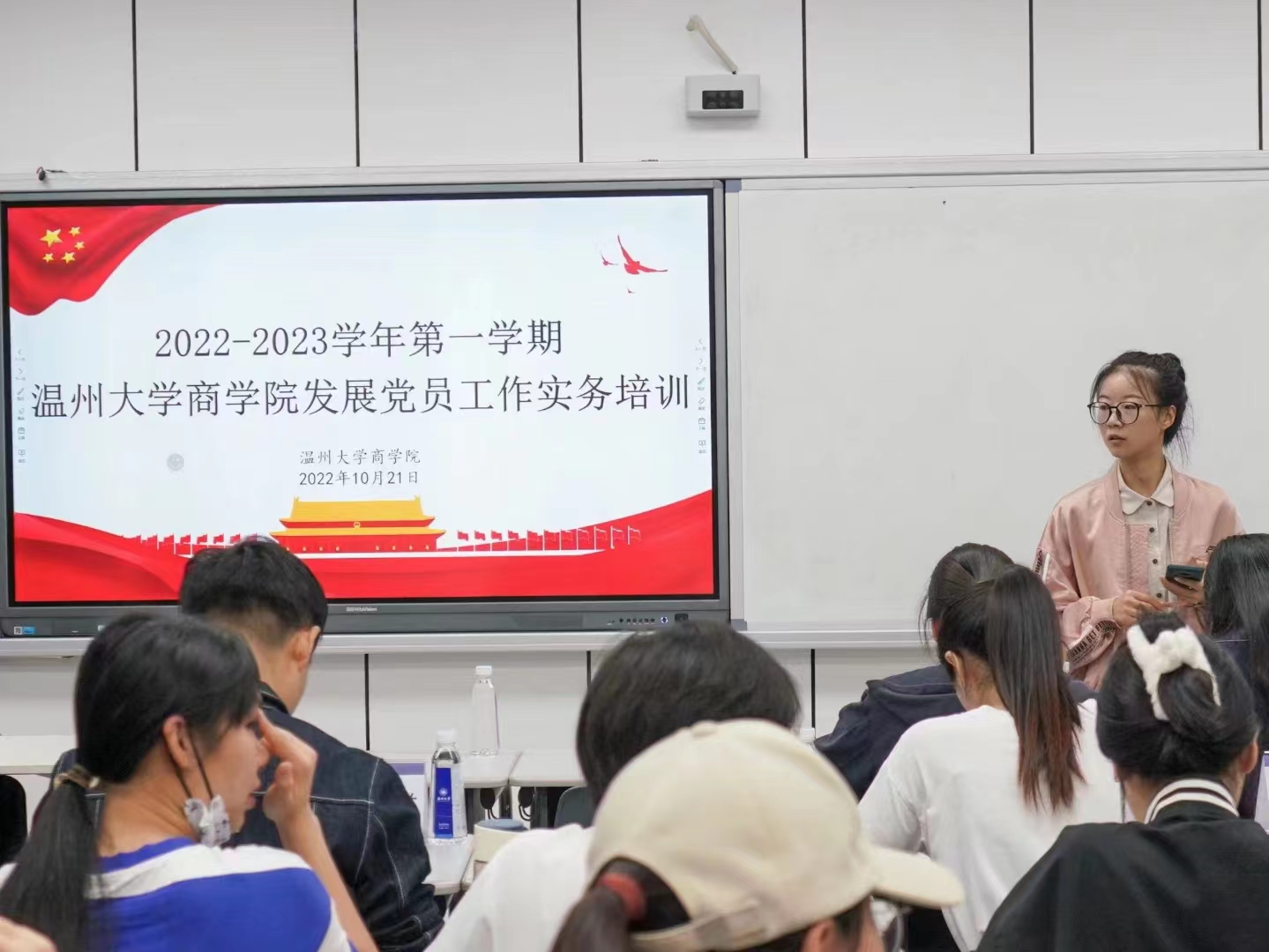 培训主讲人、商学院党务秘书聂海燕老师通过解读《发展党员工作实务小百科》一册向出席的师生们详细介绍了高校发展党员的流程和注意事项。