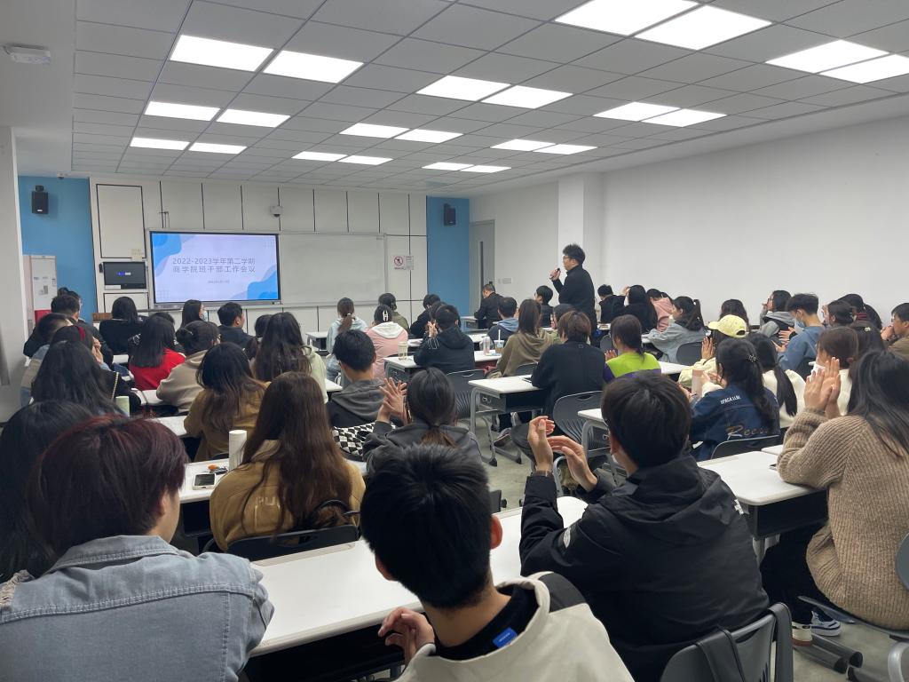会上,学生科辅导员依次在学风建设、考研、助困、评奖评优、团组织建设、学科竞赛、就业等分管模块进行了介绍,向班干部们传达了本学期的工作要点。并针对近期同学们关心的学业、校园生活等问题进行答疑。