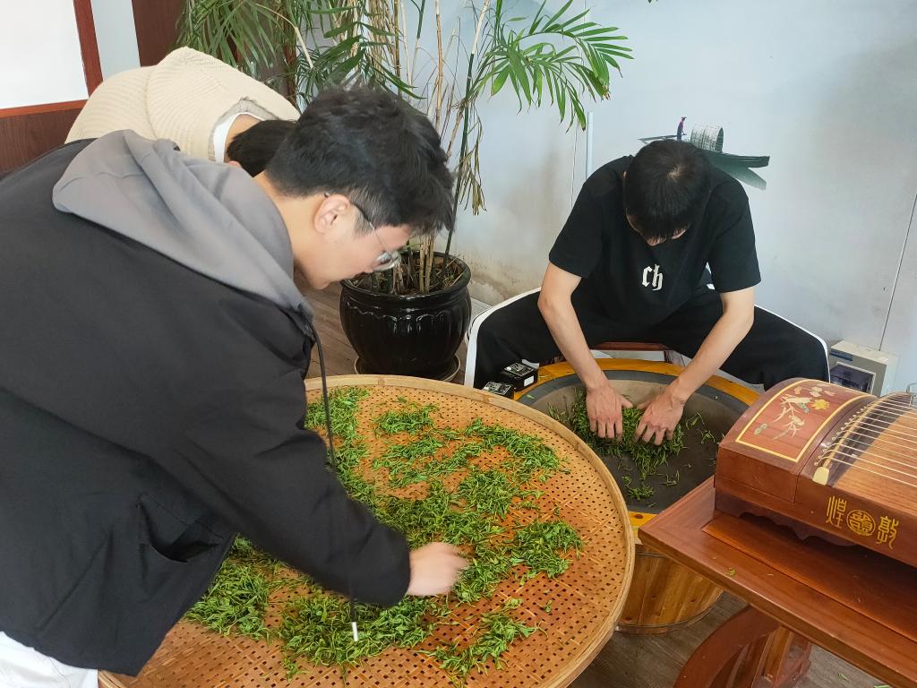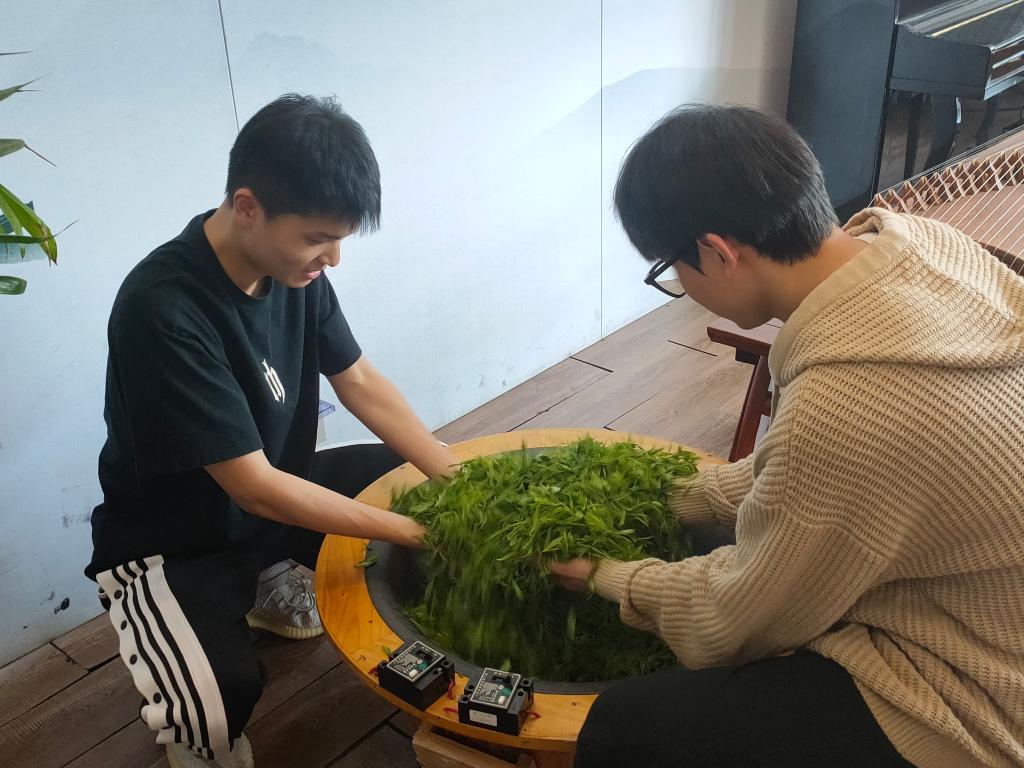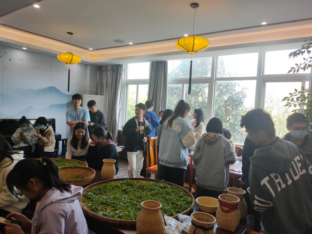 用好一课堂,细采一叶茶。在国际学院阚文文老师手把手指导识茶、采茶后,三支部的党员同志们化身采茶工,领着茶篓开始沉浸式采茶体验,专心且忙碌地穿梭在茶树之间。随后,阚文文老师还用刚采摘的新鲜茶叶向大家展示炒茶、揉茶技术,支部内党员同志们踊跃加入到炒茶的实践当中,亲身感受炒茶的劳动乐趣。党员们齐参与、共劳动,深入到农耕劳作,在“茶课堂”中体会到“纸上得来终觉浅,绝知此事要躬行”的实践真谛。