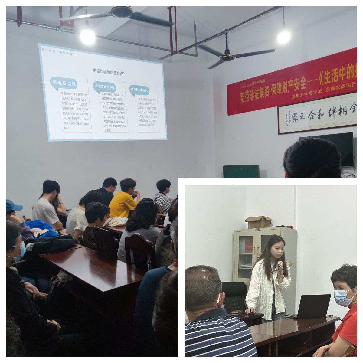随后居民逐渐到齐落座,林德根老师用普通话和温州方言向居民们介绍了此行反诈宣传活动的目的。居民朋友们和农商银行对于温州大学的学生和老师的到来表示了热烈欢迎。接着,来自学前教育专业的林语珂同学向大家进行《全民反诈宣传》,介绍了现在流行的多种诈骗类型,如电信诈骗、网络诈骗、婚姻诈骗、街头诈骗、银行卡诈骗、招生诈骗等等。同时林语珂同学用温州方言讲解并提醒居民们要注意个人的人身和财产安全,遇到没有经过证实的突发情况,不要轻易相信。要提高防范意识,飞来横财不动心,个人隐私不泄露,迷信活动不参与,偶遇路人不轻信,不贪小利,遇事要冷静,并及时向公安保卫部门报警。