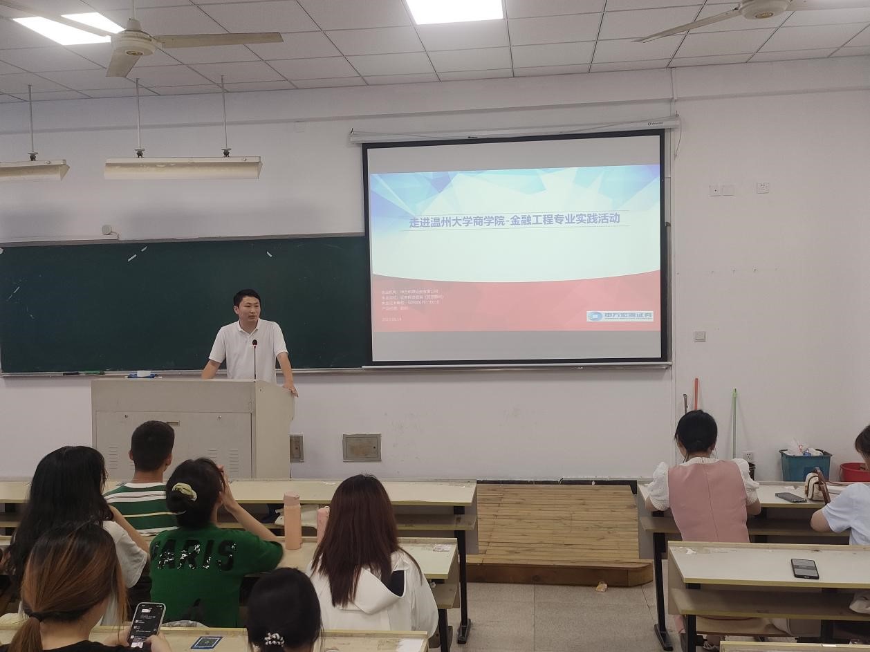 讲座伊始,温州大学张元祝老师致欢迎词。张老师向申万宏源证券温州分公司的几位主讲人表示热烈的欢迎和衷心的感谢。他注意到因疫情原因导致当前金融工程专业的见习活动较少,因此本次讲座更具有意义,可以让学生深入了解证券行业的发展现状,对学生的职业规划至关重要。同时,张老师表示很期待可以和申万宏源证券有更多的合作机会,共同打造金融教育示范基地。