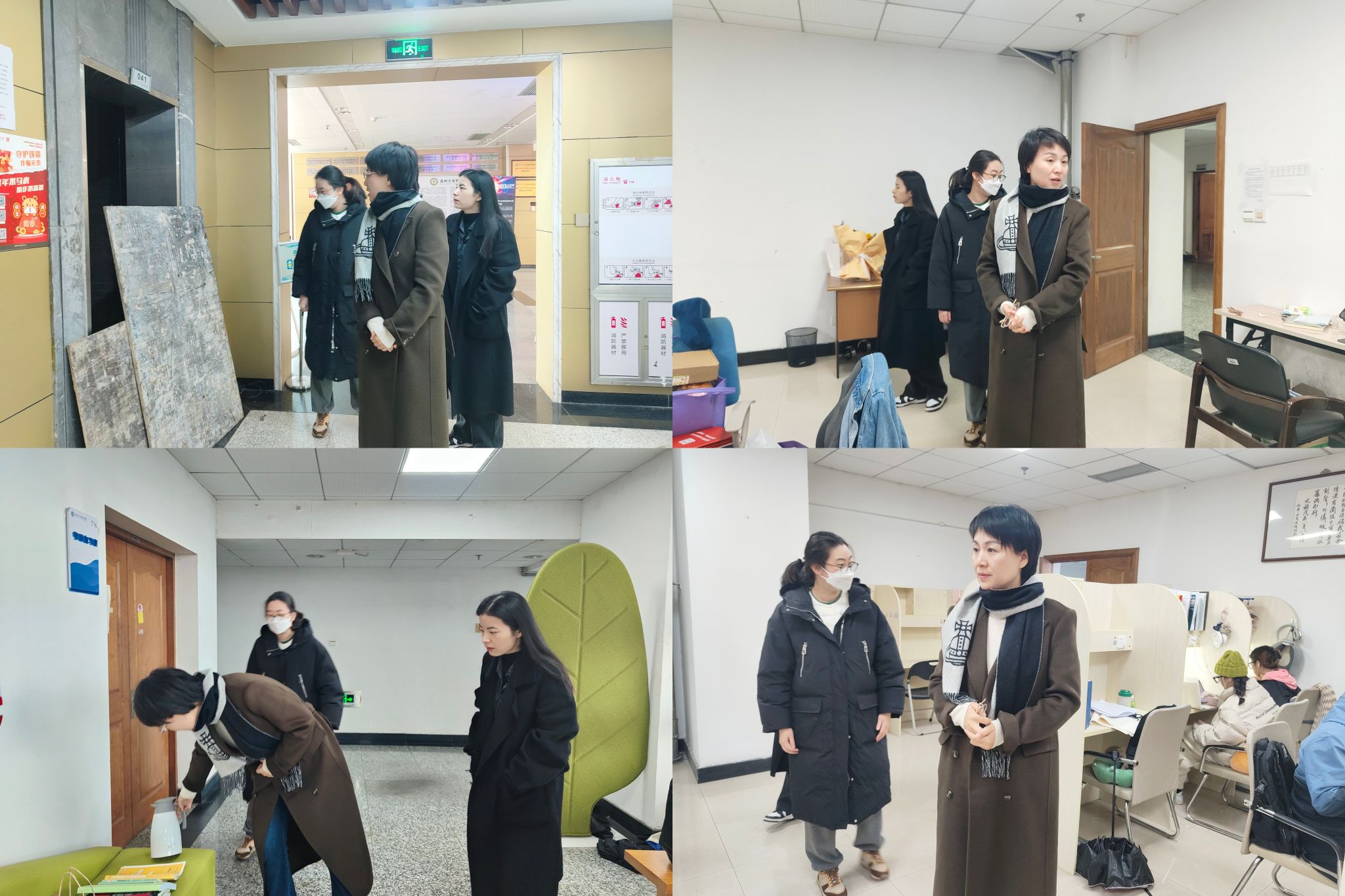 教学行政办公区、研究生自习室、考研自习室、电梯维修区、实验室等地点的安全设施隐患、用电配电、消防安全等方面进行排查,对发现的安全隐患及时整改,做好查漏补缺工作。李密书记听取了学工办关于近期学生安全工作的汇报,她指出校园安全无小事,要及时监督、及时发现、及时整改,考研初试在即,要进一步做好学生安全工作,压牢压实安全责任,确保校园安全稳定