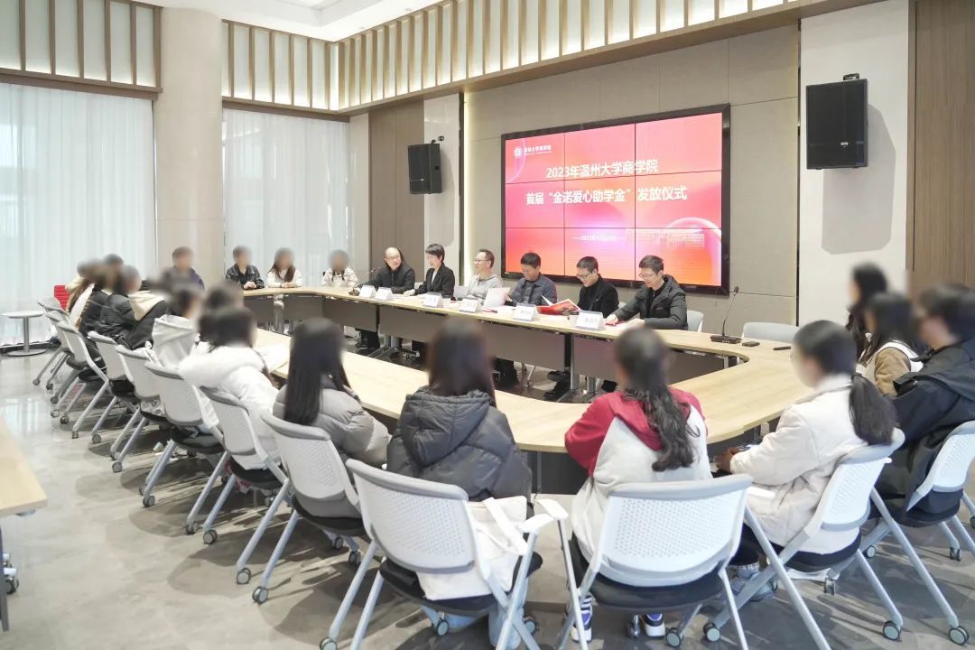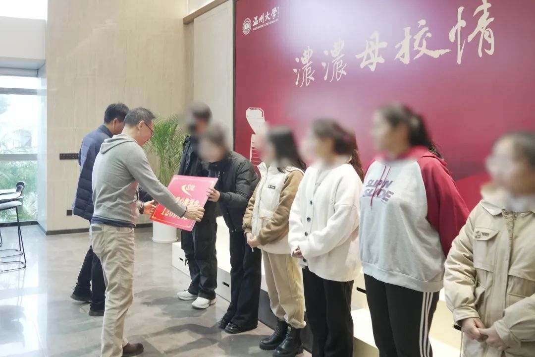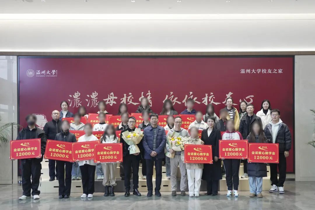 设立了“金诺爱心助学金”,旨在帮助家庭经济困难的学生顺利完成学业。接下来,庄书记对温大的发展进行了介绍。近年,温州大学迈入浙江省重点建设高校行列,获批博士学位授予单位,现已成为浙南地区重要的学术文化研究中心和人才科技汇聚高地,并锚定更高的目标前进——建设国内一流、国际知名、特色鲜明的高水平研究教学型大学。庄书记强调,学校的发展离不开师生们的共同进步,离不开校友们的鼎力支持,并对获得助学金的同学表示诚挚祝贺。借由习总书记的话,庄书记向大家提出三点要求:一是刻苦学习,练就本领;二是心怀感恩,回报社会;三是心中有梦,勇于追梦。最后庄书记对刘军校友再次致以衷心感谢。