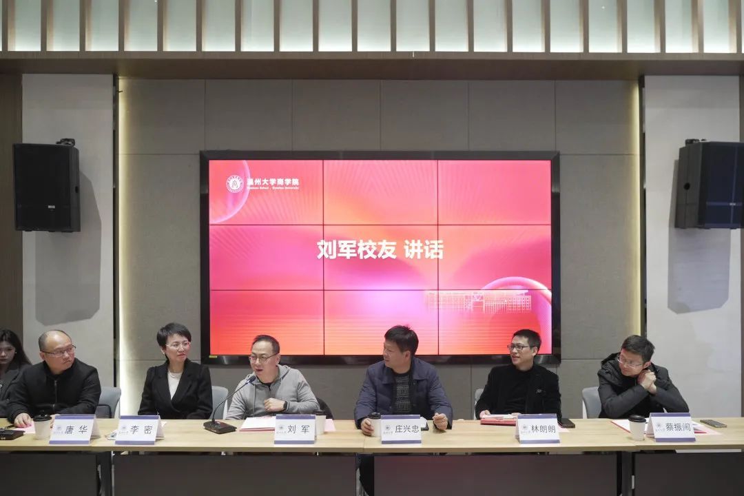 紧接着,刘军校友为同学们带来了以“商务人士应具备的品质”为主题的沙龙讲座。首先,刘军校友表示,思维是极其重要的,思维能改变人的一生,除此之外,机遇对于我们来说也尤为关键。他创业的时候正巧赶上了改革开放的机遇,并且抓住了这个机会,使他的事业取得极大进展。刘军校友还表示温州是个思维先进、开放,务实的城市,希望同学们能够把握这个优势。他列举了多个事例说明温州大学思维上的优势,希望同学们重视思维的发展、眼界的开拓。随后,刘军校友分享了三点至关重要的“生意经”。第一是善良,心宽一寸,受益三分;第二是诚信,人而无信,不知其可也;第三是远见,见微以知萌,见端以知末。