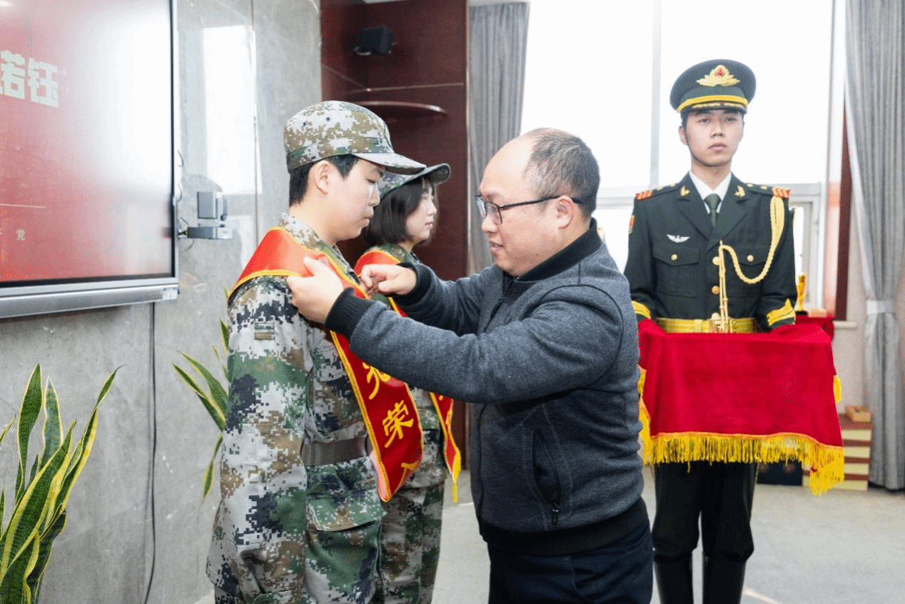 党委副书记唐华为两位同学佩戴绶带和大红花,并合影留念。
