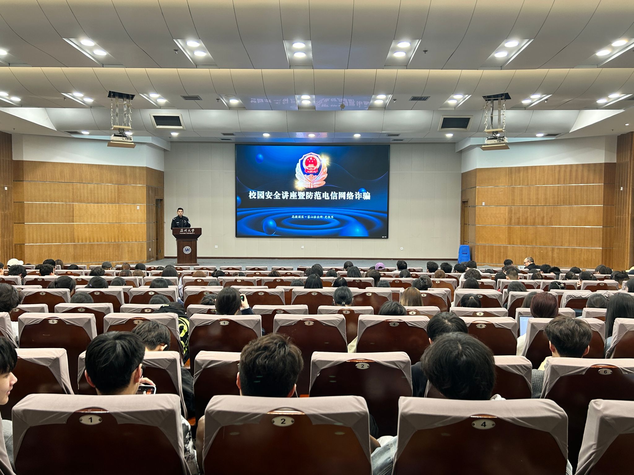 茶山派出所的史铁军警长为听讲学生作防范电信网络诈骗的安全专题讲座。史警官从大学生面临的严峻诈骗环境开始讲起,分析了近年来高校受诈骗人数的增长以及受骗人员类别的变化趋势,史警官还列举了当前较为高发的几种诈骗形式:游戏账号买卖、快递客服和网络刷单等等。同时利用生动的例子讲述常见的诈骗手法,并结合自身工作经历告诫大学生们防范电信网络诈骗的要领:不要点、不要慌、不要信、不要贪、不要转,提高警惕。讲座还简单提及了高校学生如何预防毒品危害,反邪教、宗教渗透等方面的安全知识。