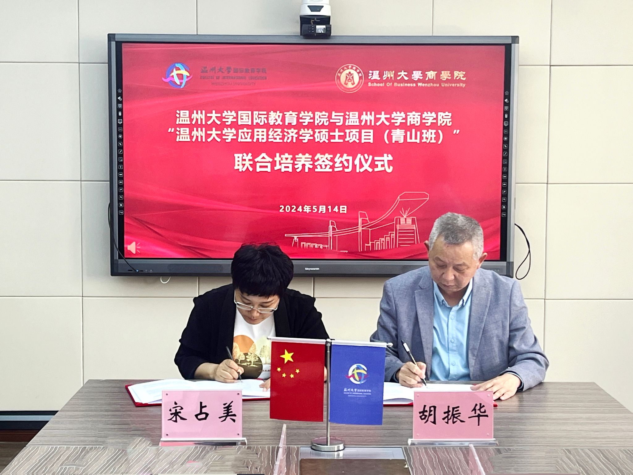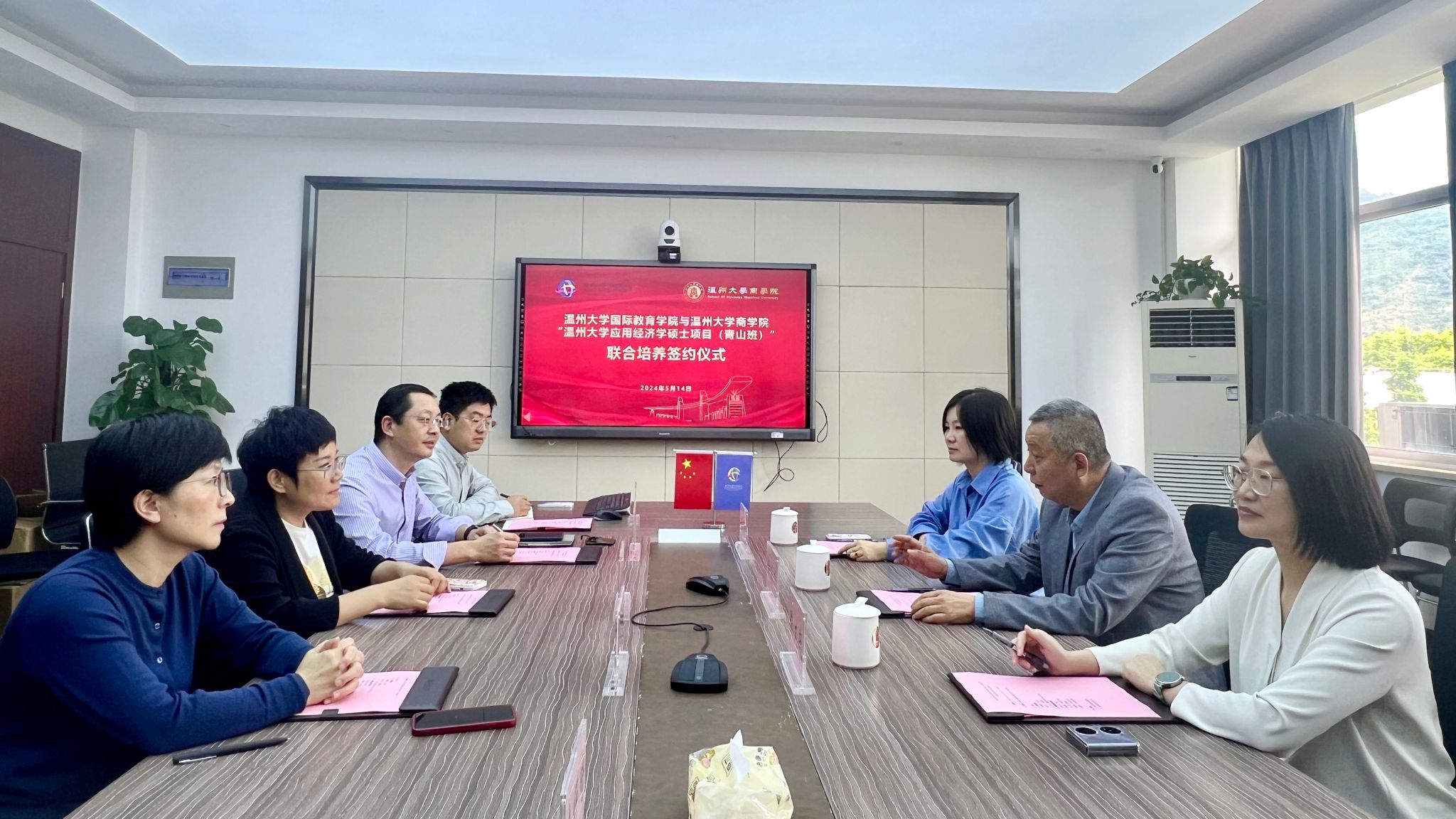 双方回顾两院长久以来的友好合作情况,表达开展深入合作与联合培养国际化人才的意愿。随后双方就该人才培养项目的重要性与发展规划展开交流探讨并签署合作协议,标志着“温州大学应用经济学硕士项目(青山班)”联合培养项目正式启动。