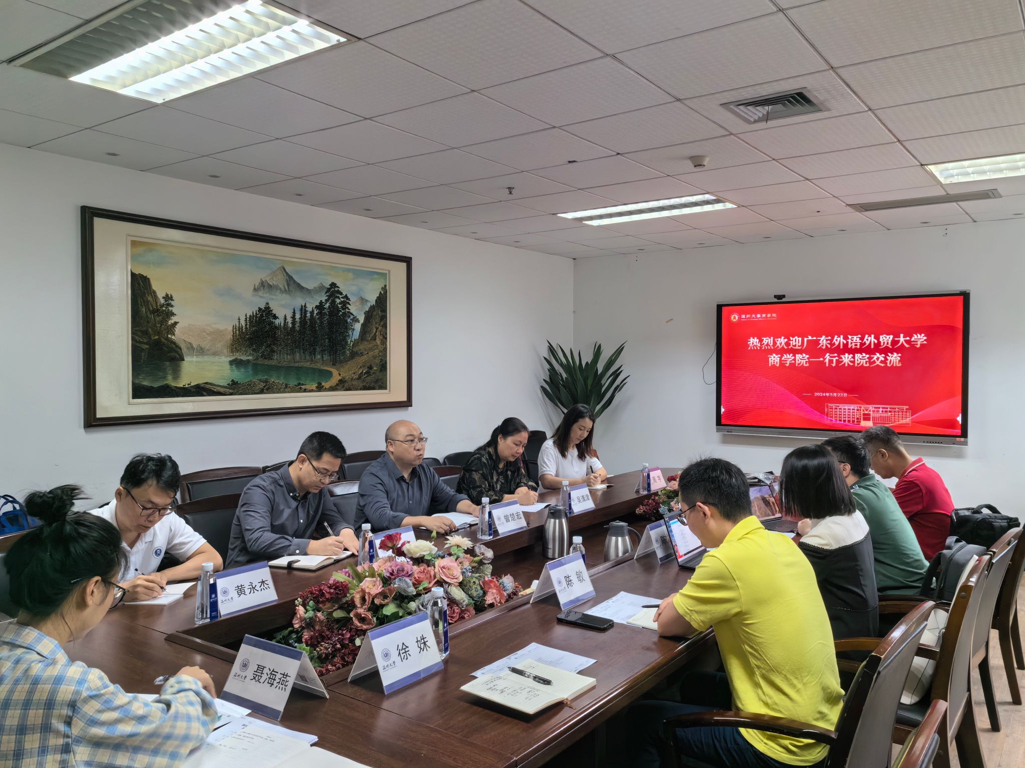 交流会上,我院陈文芝副院长首先对到访的一行人表示欢迎,结合学院宣传片,简要介绍了我院的整体概况。会上,双方围绕国一流专业建设、新商科人才培养方案、数字化课程建设、国际化人才培养以及实习实践基地建设等等方面进行深入讨论和广泛交流,双方对专业内涵建设、人才培养创新模式等方面的开展情况和存在的问题进行了分享,也交换了可以互鉴的经验。
