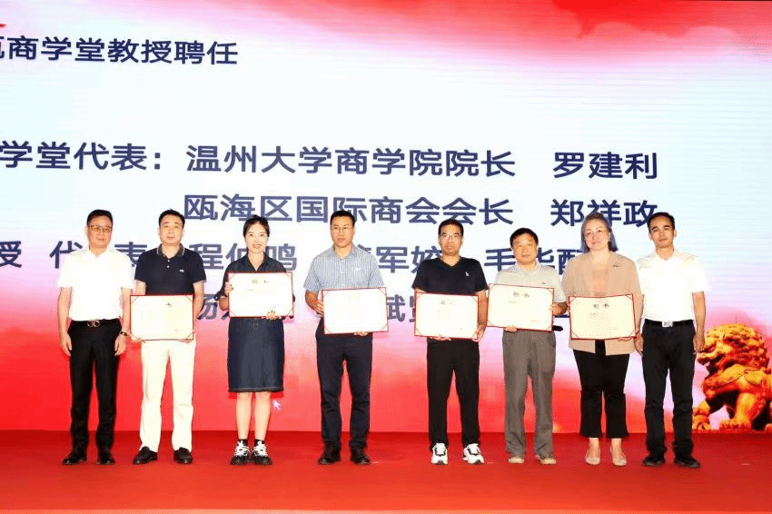 院长罗建利与瓯海区国际商会会长郑祥政共同接过“瓯商学堂”铭牌,标志着瓯海区国际商会会员企业人才培养与知识赋能的新篇章正式开启。随后,举行了瓯商学堂(专家智库)教授聘任仪式,首批聘任罗建利、周家儒、胡振华、张一力等20位教授,其中温大老王论坛