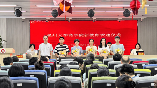 随后,唐华书记对本学期新加入商院的六位教师:潘胜、陈志鸟、叶僖僖、徐雅、安亚峰、王长岳进行一一介绍,罗建利院长为其赠送鲜花并代表学院表示热烈欢迎。欢迎仪式后,唐华书记向全院教职工宣读了学院内设机构负责人名单。