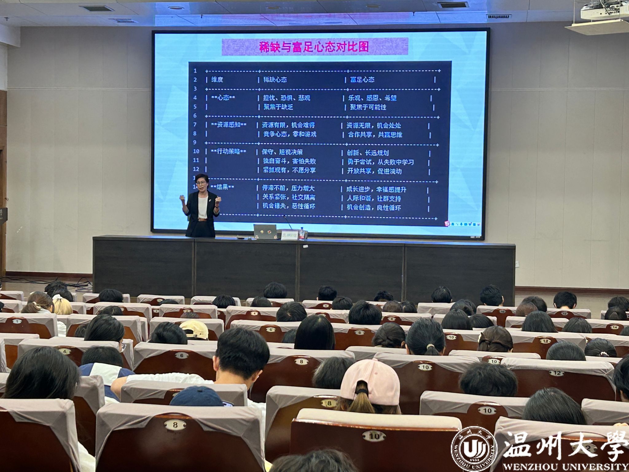 幸福课伊始,郑彩莲老师以稀缺为切入点,深入浅出地探讨了这一概念对个体心态的影响。她借助一系列鲜活的案例,生动形象地引导同学们深入反思自身的精神状态,真正认识和理解“稀缺”本质。她指出,生活中大部分人会常常陷入“稀缺”状态,而忽视了内心的需求和精神的富足,进而在无形中左右着大家的生活与学业,对决策和行为方式带来负面影响。