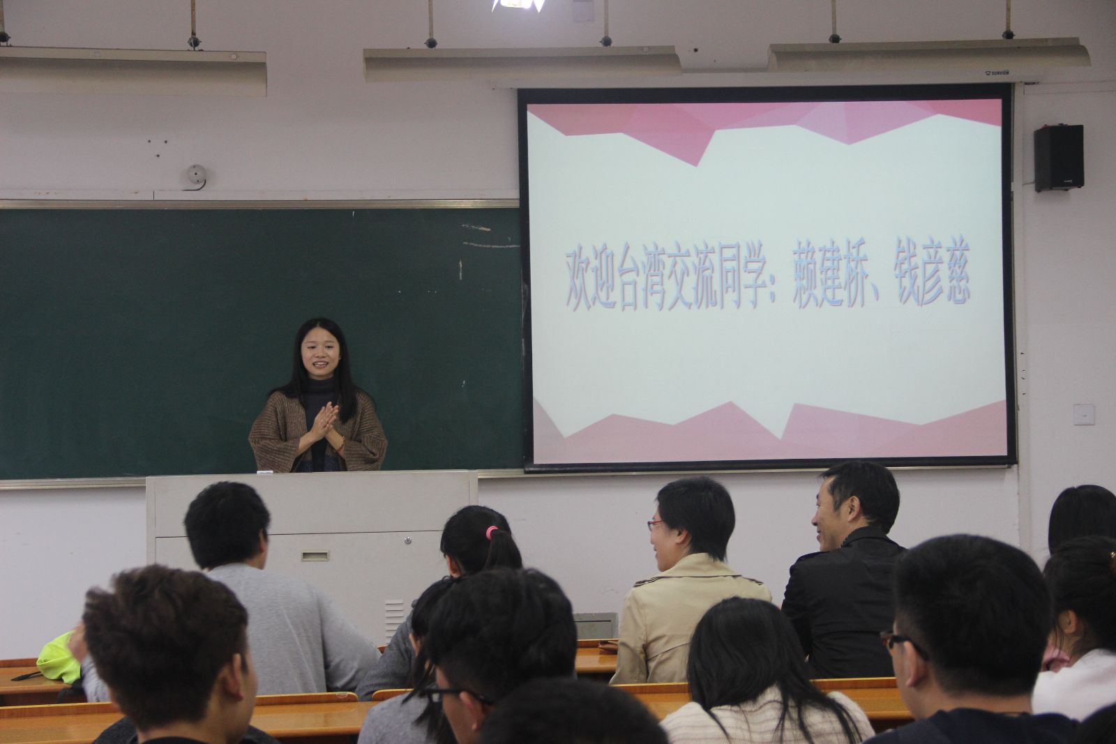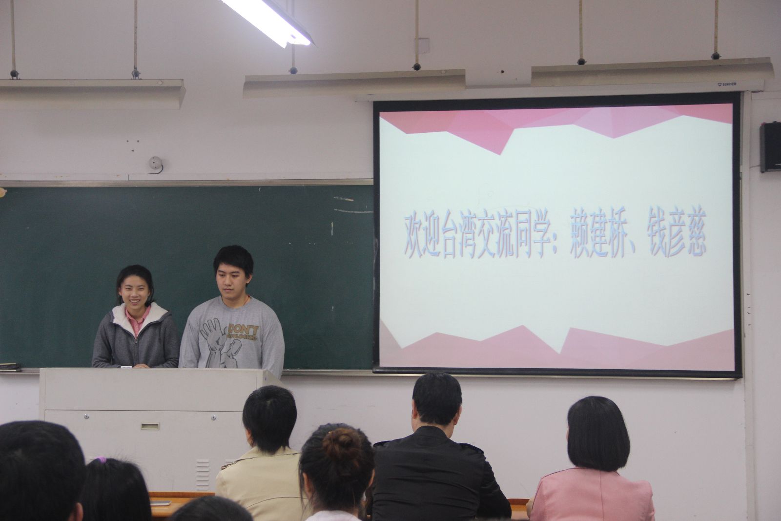 欢迎会上,来自台湾佛光大学的赖建桥、钱彦慈两名同学向在座老师、同学做了简短的自我介绍,并分别分享了自己在温州大学两个多月学习生活的亲身体验,他们谈到两地高校在校园文化、地域生活、管理制度方面的差异,感谢学院提供的优良师资、舒适完善的学习、生活环境和班级同学给予的关心和帮助。