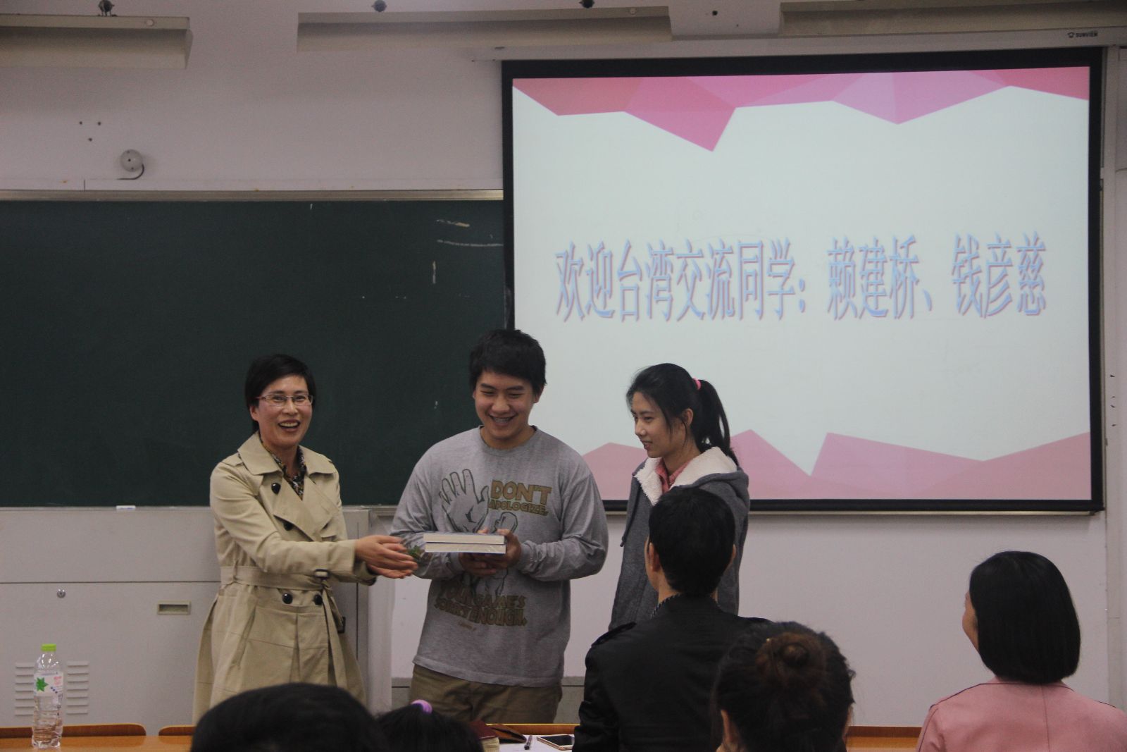 最后,郑书记代表学院向两名交换生赠送了两套图书,鼓励两名同学回到台湾后仍能为两岸和平发展贡献力量。