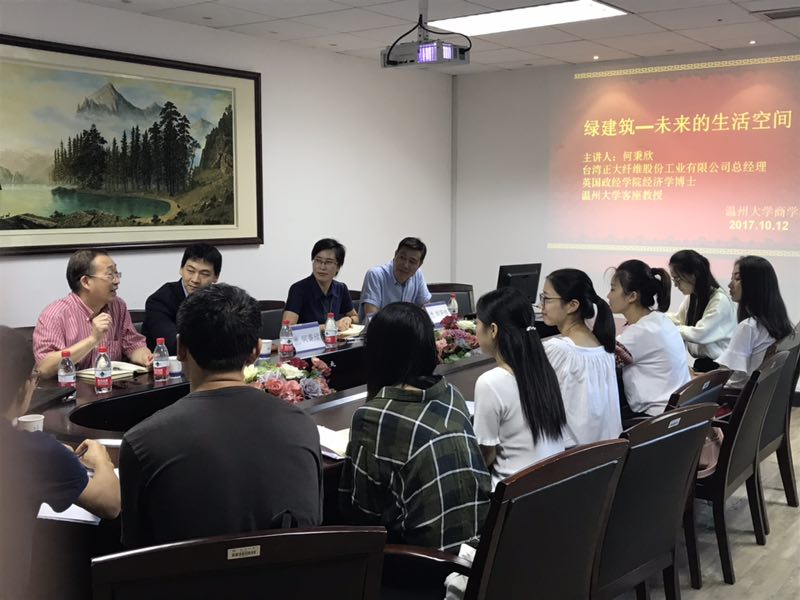 222会议室为研究生师生做了一场名为《绿建筑——未来的生活空间》的主题演讲。何秉欣先生是著名慈善家何朝育之孙、英国政经学院经济学博士、温州大学客座教授、台湾正大纤维股份工业有限公司总经理。