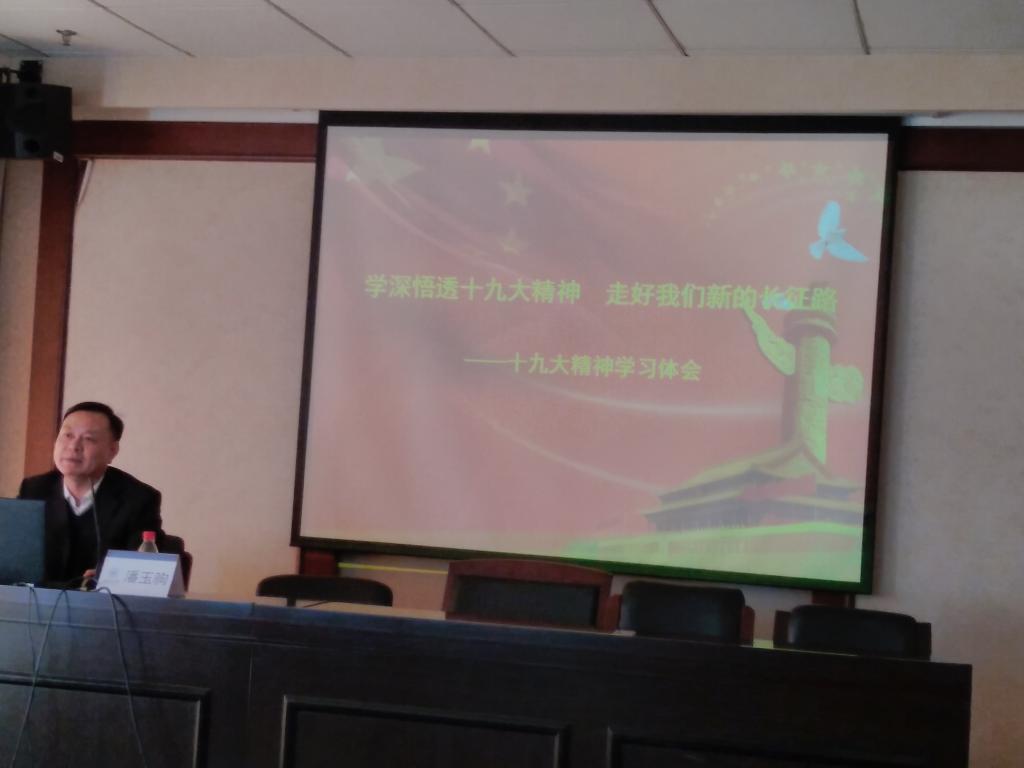 2017年11月22日,校党委委员、宣传部长潘玉驹受邀莅临我院作十九大精神辅导报告,潘部长做了《学深悟透十九大精神,走好我们新的长征路》的专题报告。会议由学院党总支书记郑彩莲主持,学院全体教工聆听了报告。
