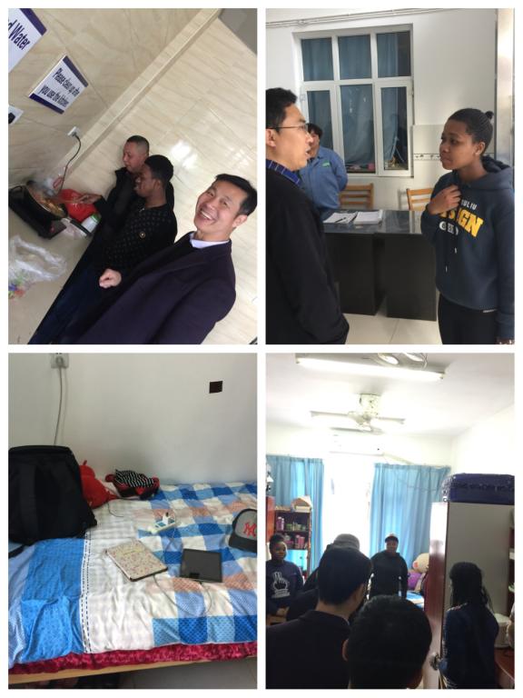 接下来胡院长一行,又相继走访了位于三楼的Ahmed Mohamed Ali,Geza Dean Tawanda等男生的寝室,位于四楼的Katiyo Linda,Mugoni Yemurai Viola,Paschal Janerose Kokutona等女生的寝室,这些寝室整体卫生状况非常好,氛围非常温馨。每到一个留学生寝室,胡振华都用英语与同学们亲切的交谈,胡院长的热情和幽默赢得了同学们的阵阵掌声和笑声。同时,每到一个寝室胡振华一行都给寝室同学送上了一份小礼物。同学们非常感谢学院领导的馈赠。