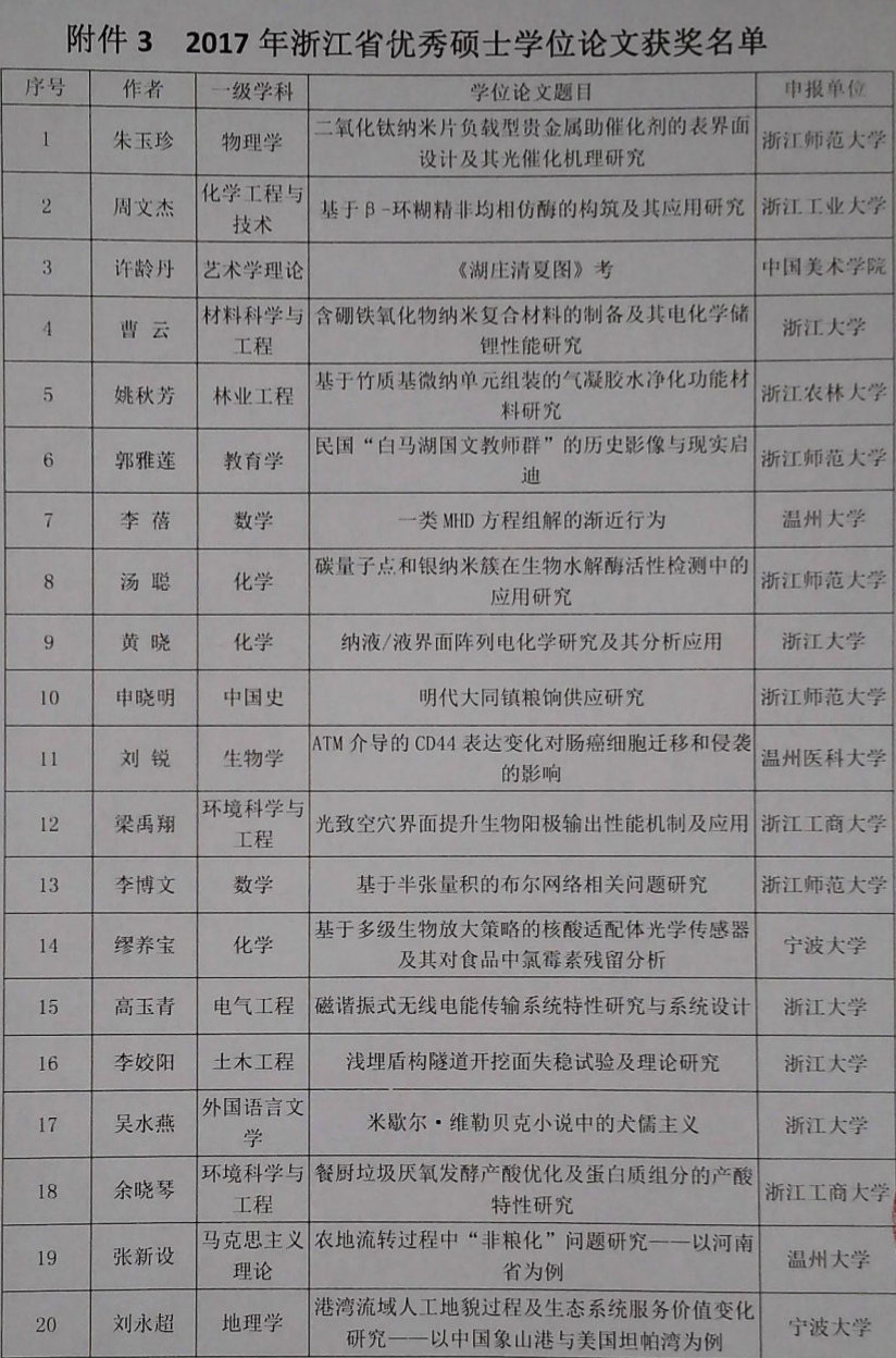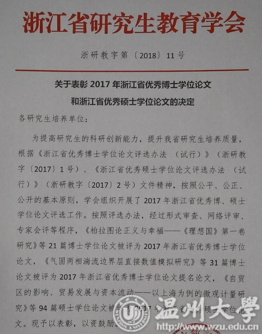 老王论坛-中文论坛-成人论坛 14级研究生张新设(指导老师:胡振华教授)硕士论文被评为浙江省优秀硕士论文,该篇论文是全省唯一一个马克思主义理论类论文,该同学也是老王论坛 首位浙江省优秀毕业论文的获奖者。