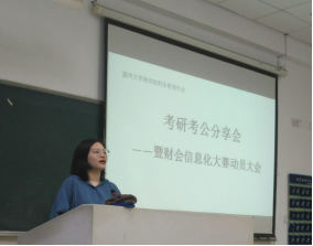 由财会系党支部牵头、张敏老师和陈建萍老师组织、温大会计协会协助落实的“考研考公分享会暨2019年财会信息化竞赛启动大会”于2019年5月8号在北校区3-401如期举行。本次会议酝酿了一个多月,邀请了来自2015级财管的候晨瑶、陈晓莎等5位考研考公的学生代表。候晨瑶同学以笔试第一和复试第一的成绩考进了浙江财经大学会计学学硕,单佳男同学以复试第一综合第八的成绩考入了浙江财经大学会计学专硕,韩海燕以前10的成绩考进了浙江工商大学会计学学硕,陈晓莎和鉏楷文以第二名的成绩分别考入绍兴国税和嘉兴国税。他们分别从考研的院校选择、时间进度安排、书籍课件选择、专业课程的准备、考公的准备等方面给学弟学妹们做了有关非常详细的分享与经验交流。张敏老师从决心、信心和恒心来鼓励大家,从学习氛围、如何备考和坚持以及专业课程设计来引导大家交流。最后陈建萍老师就今年的财会信息化竞赛做了简要的动员。本次活动是一次答疑解惑的思想交流,是一次优良学风的传承,更是一次支部建设融入学科专业建设的体现。
