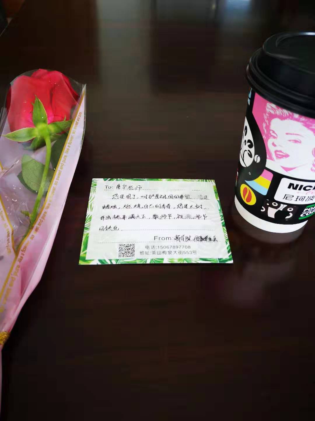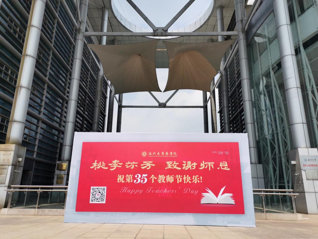 学院团委学生会在商院楼前以巨幅广告牌“桃李芬芳 致谢师恩!祝第35个教师节快乐!”,还组织所有的班级都举行了尊师仪式,代表全院学生给每位行政人员和任课教师献一束鲜花,一张贺卡,一杯咖啡。咖啡由老王论坛
