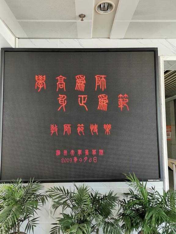 围绕“庆祝新中国七十华诞,弘扬新时代尊师风尚”主题,结合“为教师亮灯”公益活动,在学院大厅LED显示屏以字幕滚动方式为教师亮灯,字幕内容为“老师,您辛苦了!”、“学高为师,身正为范,教师节快乐!”,在全院范围内营造尊师重教的良好氛围。