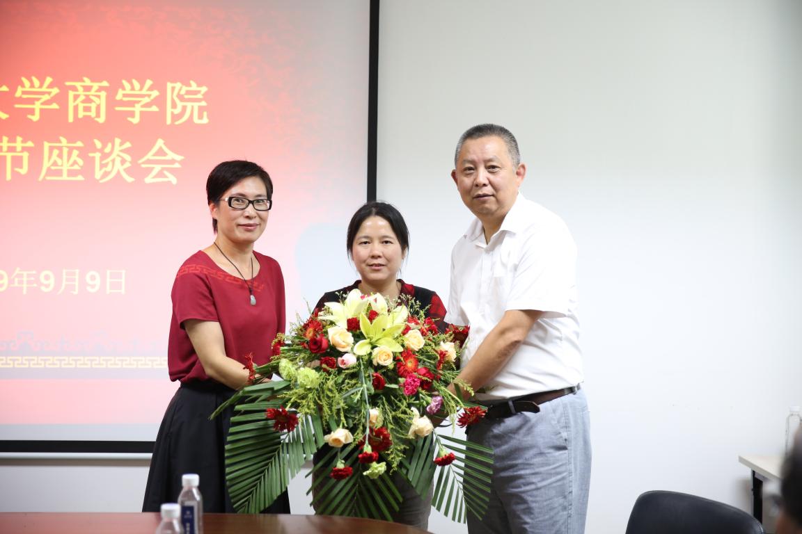 教师节座谈会,学院领导班子全体成员及部分专任老师团队、行政老师团队、辅导员团队代表参加座谈会,座谈会由学院书记郑彩莲主持。向教师代表通报校情及人事工作情况,了解他们的工作和生活情况,倾听他们的诉求和对学校发展的意见建议,欢送退休教师杨焕春和刘藏岩老师,给退休老师在学院微信公众号做专题推送留念,给台胞林怡芯老师赠送鲜花,当天在学院的所有老师合影留念和视频祝福(视频另发)。