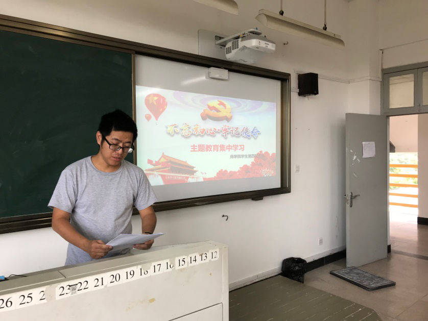 大会第一项议程:书记讲话。为推进“不忘初心、牢记使命”主题教育深入开展,结合新时代新要求,第四党支部召开集体学习大会,会上,书记告诫学生党员要在保持先进性和活力,为人民谋幸福的同时,做到不忘初心、牢记使命,拥有自我革新精神,跟紧时代步伐,从而推进党的自我革命。