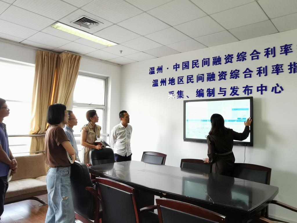 教工第五党支部于9月25日下午走访调研了位于信息楼4楼的金融研究院,调研了温州大学金融研究院的重点研究项目——温州指数研究中心,一个专门检测温州民间融资综合利率指数的研究室,全称是温州地区民间融资综合利率指数采集、编制与发布中心,金融研究院谢蓓蓓老师介绍了研究院的现状和温州指数的构成。2013年该中心正式发布温州地区民间融资综合利率指数,这是反映一定时期内民间融资价格变动情况及趋势的一套指数体系。中心的主要职责就是为了减少民间融资信息不对称,反映民间融资市场的资金价格,引导民资规范,阳光发展。