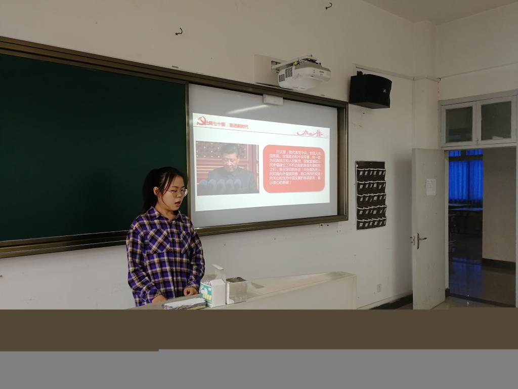在回首党的三个伟大历史贡献之后,宣传委员不禁发表感慨:这是中国的伟大成就,也造就了我们伟大的祖国。七十年前的我们,飞机不够飞两遍,七十年后的我们,可以挺直腰板说要飞多少飞多少。我们不得不感慨中国的飞速进步,与此同时内心的民族自豪感无以言喻。一句“中国的昨天已经写在人类的史册上,中国的今天正在亿万人民手中创造,中国的明天必将更加美好”让全体党员都心潮澎湃,下意识挺直了腰板,这不仅是一个青年人的担当,更是作为未来党的接班人的使命。最后的三个“万岁”更是点睛之笔,让人为之震撼。