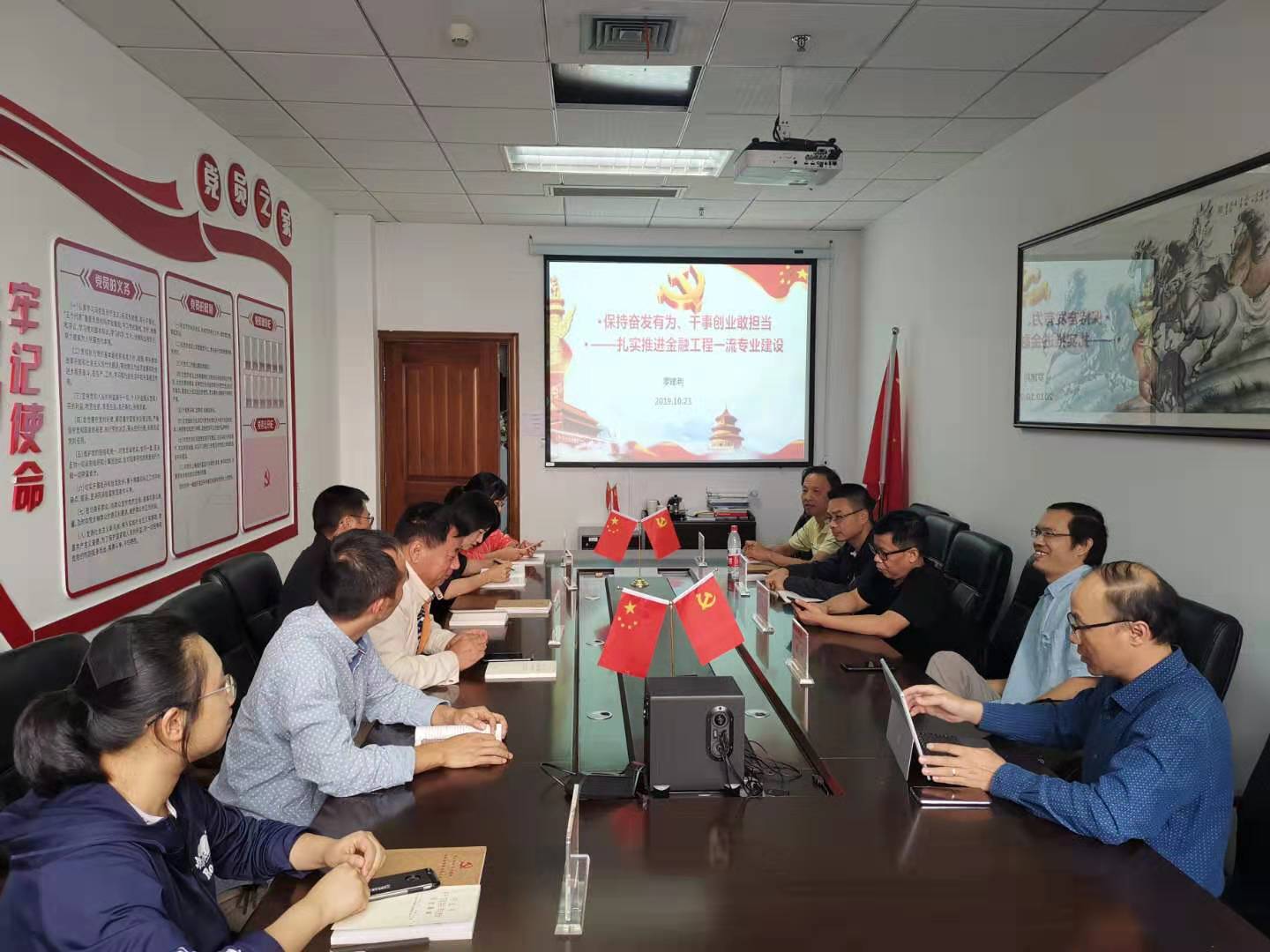 副院长罗建利和教工第一支部书记周建华在A223党员之家为支部党员同志上党课,内容分别为《保持奋发有为、干事创业敢担当——扎实推进金融工程一流专业建设》《践行“两山”理论,打造美丽中国》。