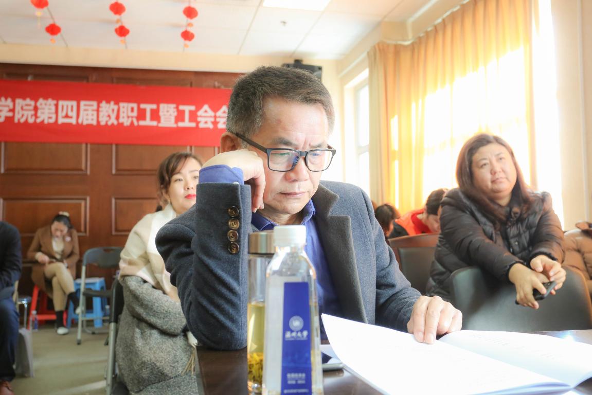 校党委副书记庄兴忠同志致辞,他认为学院隆重召开第四届教职工暨工会会员代表大会是事关学院建设发展的一件大事,也是事关全体教师切身利益的一件大事,非常欣喜与各位老师们坐在一起,共享学院发展成果,共商未来发展大计,代表学校党政班子对会议的胜利召开表示热烈祝贺! 向与会的全体教职员工表示诚挚的问候!他充分肯定了过去一年老王论坛