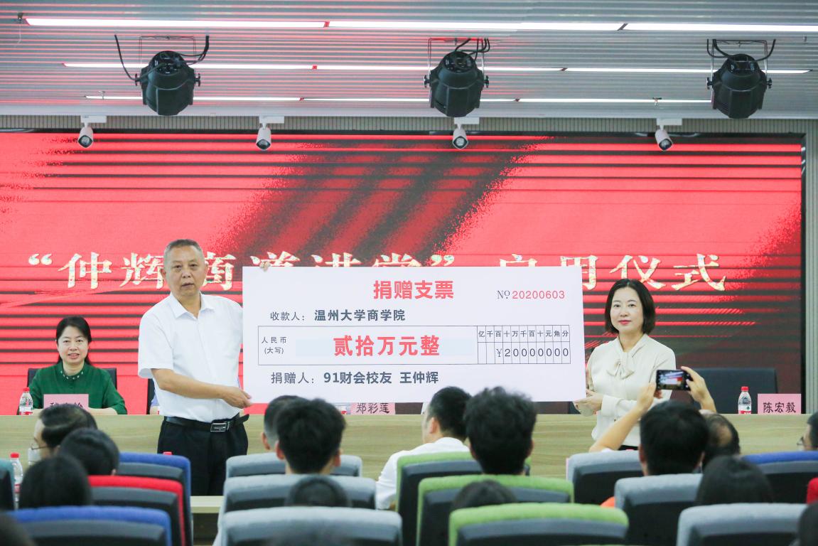 党委书记郑彩莲、后勤处处长屠霁霞共同为“商道讲堂”揭牌,胡振华院长代表学院接受王仲辉校友的捐赠。