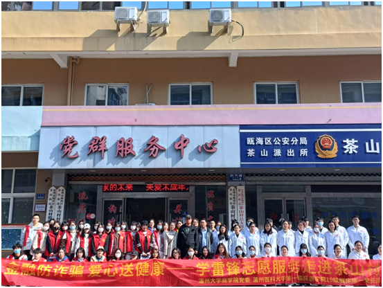 与温州医科大学临床医学院的学生党员们赴博园社区、茶山村等地开展“金融防诈骗,爱心送健康”主题志愿服务活动,为社区居民普及金融知识,提供医疗健康服务。