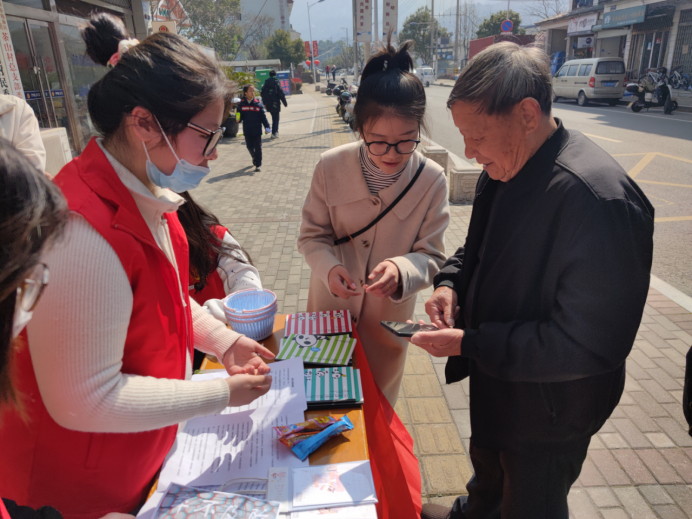 除此之外,温州医科大学第一临床医学院19级第一临床党支部的“天使”党员志愿者们为茶山村居民提供量血压、测血糖等爱心义诊服务,耐心细致地为居民科普医疗健康知识,春季传染病预防指南等,现场人头攒动。
