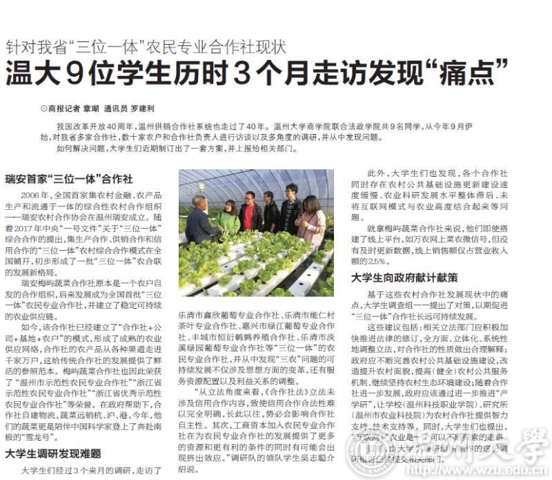 大学生们经过3个来月的调研,走访了乐清市鑫欣葡萄专业合作社、乐清市能仁村茶叶专业合作社、嘉兴市绿江葡萄专业合作社、丰城市恒衍鹌鹑养殖合作社、乐清市淡溪绿园葡萄专业合作社等“三位一体”的农民专业合作社,并从中发现“三农”问题的可持续发展不仅涉及思想方面的变革,还有服务资源配置以及利益关系的调整。