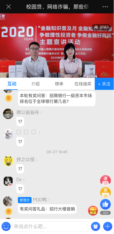 直播初始,通过“对金钱的态度”小测试开始,引出话题内容;接着,分析了校园贷的定义和形式,用数据和风险点介绍了校园贷的危害,并教学大家如何防范校园贷;然后,通过四个近期的案例讲述电信网络诈骗内容;最后,两位主播跟师生们介绍了我们招行总体情况,带领大家领略招行风采。直播中,两位主播通过问答互动和线上抽奖的形式,加强师生对知识的吸收,并给大家送去了招行小招喵系列礼品,传递金融知识和品牌宣传相辅相成!