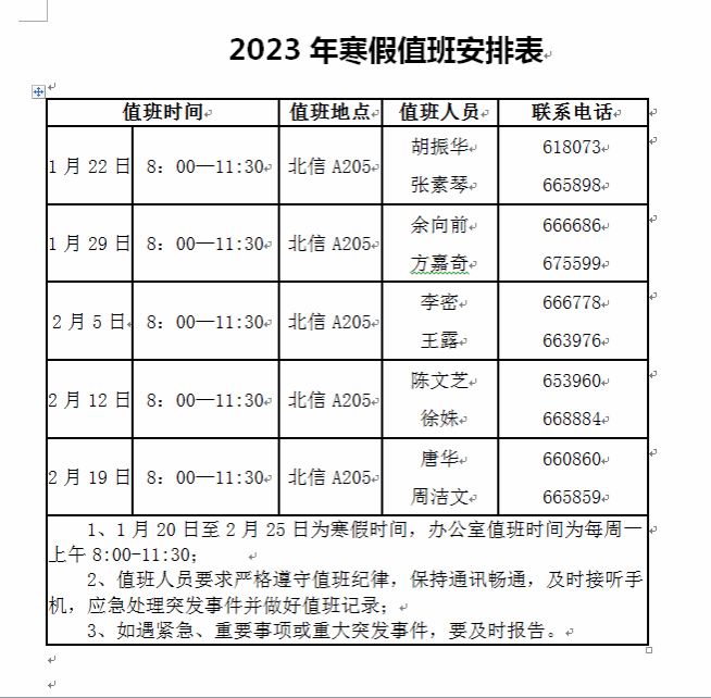 2023年寒假值班安排表