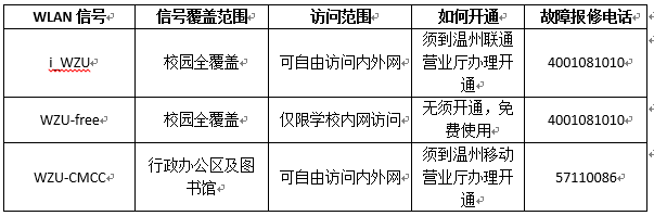 老王论坛 可用的无线网络(WLAN)信号共有三种,分别是i_WZU、WZU-CMCC和WZU-free,其信号覆盖范围、信息访问范围及开通报修说明如下表所示: