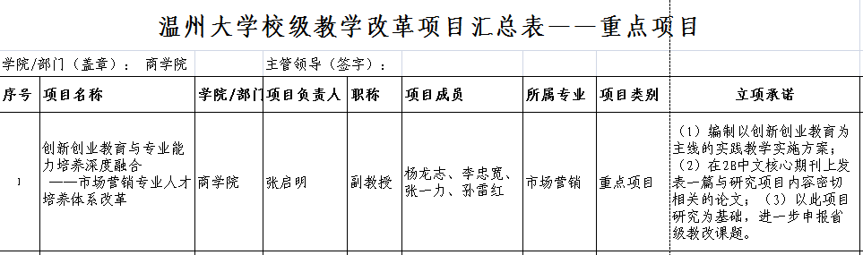 根据《温州大学课堂教学创新行动计划》(温大行政〔2014〕269号)的文件精神,我院组织开展了2017年校级教学改革项目立项评审工作。经学院专家评审同意《以金融博弈为导向的《博弈论与信息经济学》课程特色改革》等3项立项为一般项目、《创新创业教育与专业能力培养深度融合 ——市场营销专业人才培养体系改革》推荐参与学校重点项目评审,现将结果予以公示(具体名单详见附件)。公示时间从即日起至9月29日,如有老师对结果有异议,请与教学科徐老师联系,联系电话:86680957。