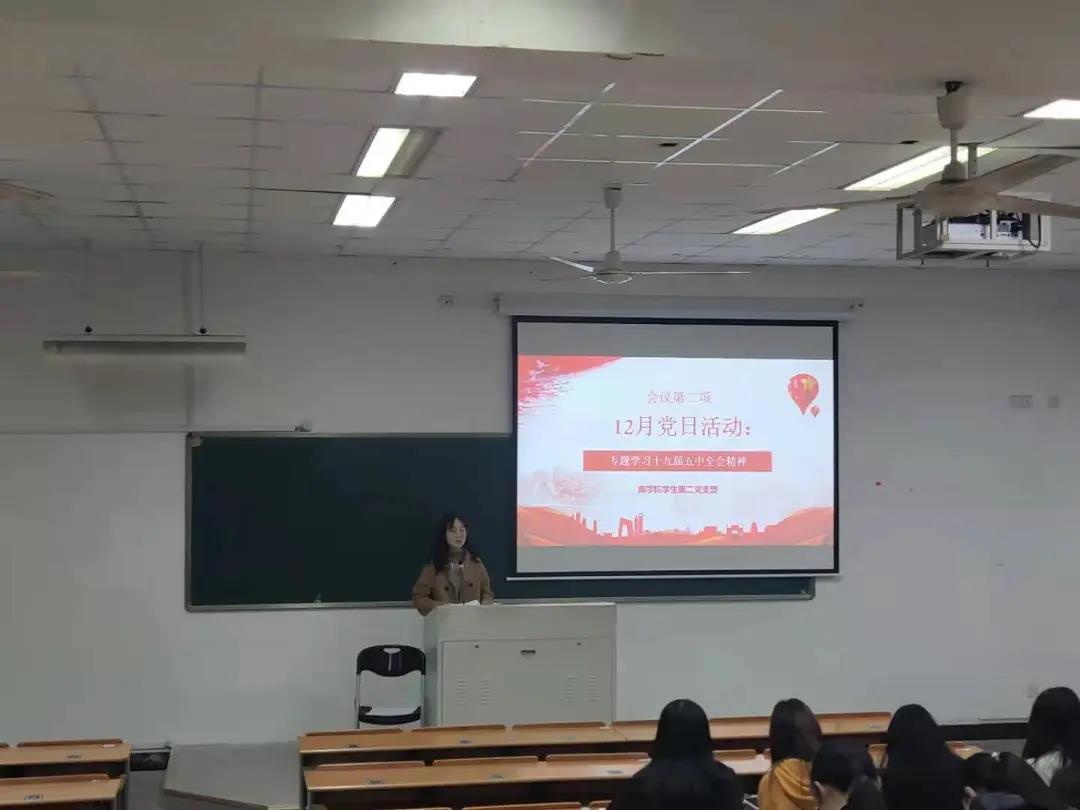 学生第二党支部“学习十九届五中全会精神”专题学习党日活动于2020年12月11日晚上18:30在北二402教室举行,本次党日活动由党支部书记金瑞老师和支部全体党员参加,党支部书记助理周优优主持。