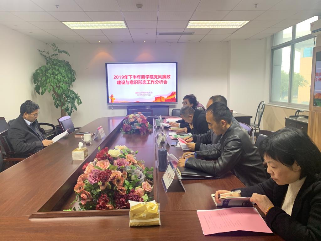 楼A222会议室召开2019年下半年党风廉政建设和意识形态工作分析会。校党委副书记庄兴忠、学院领导班子成员、党委宣传委员周洁文、纪委委员张素琴出席了本次会议。会议由学院党委郑彩莲书记主持。